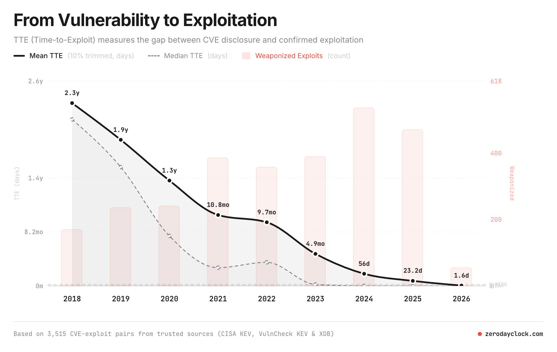 The time from vulnerability disclosure to working exploit code has reportedly shrunk from 2.3 years to 1.6 days.